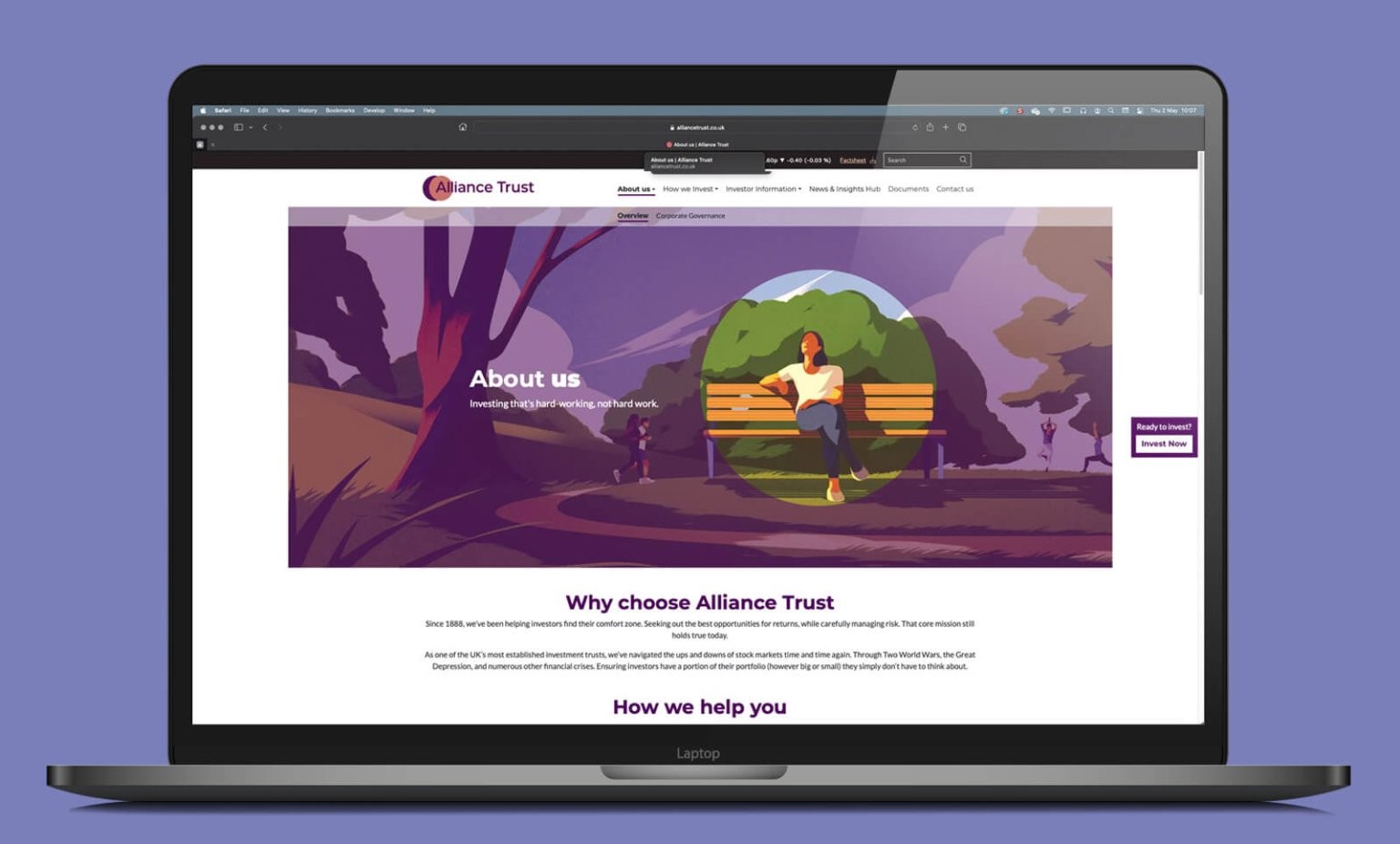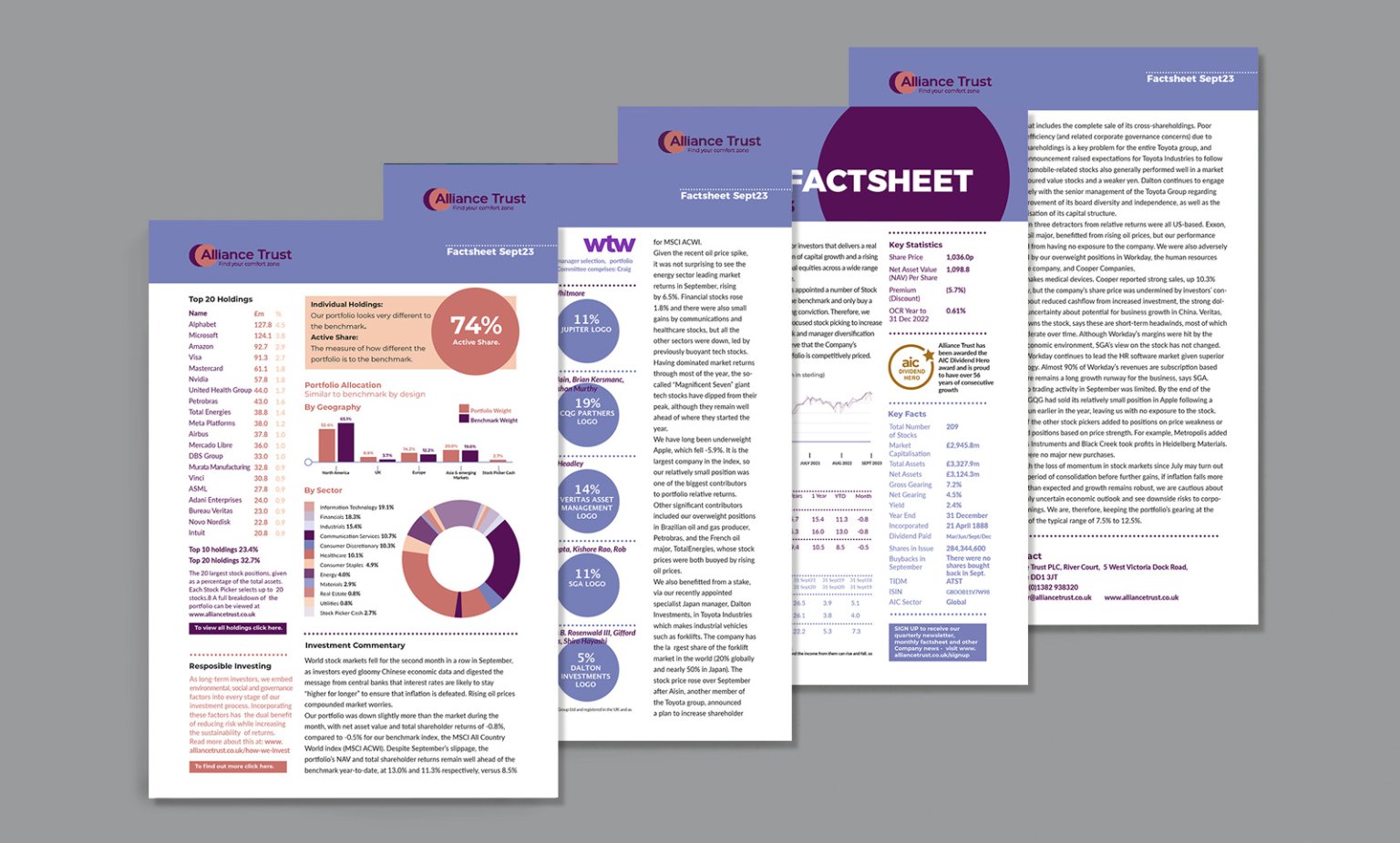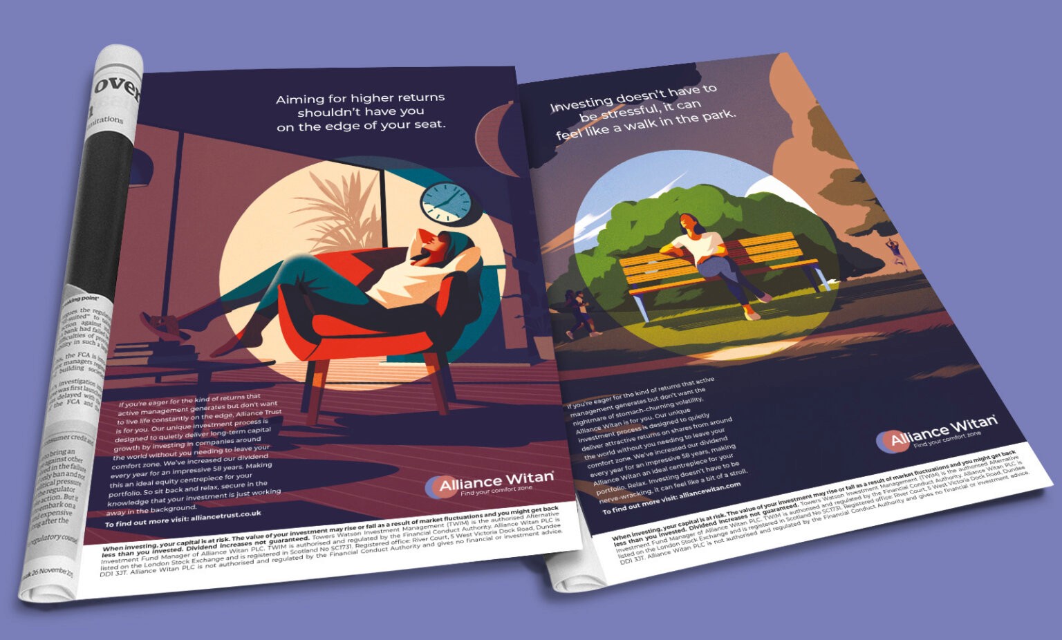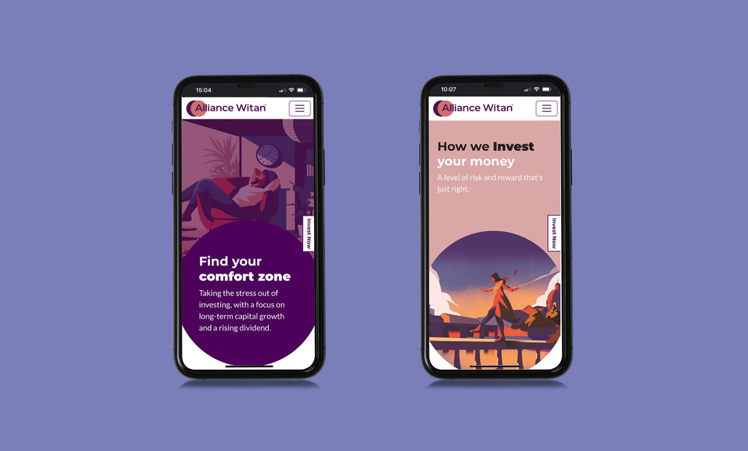 Alliance Witan are an investment trust with a remarkably solid track record. But they were perceived as fusty and dull. Our big idea here was to make a virtue of their reliability. Many ordinary people are very nervous about investing in stocks and shares, so we created an investment ‘comfort zone’ a place symbolised by a circle representing a comfortable bubble of safety. The illustration style and the circular device feature in all the brand’s communications, including the website, as did our new logo design.