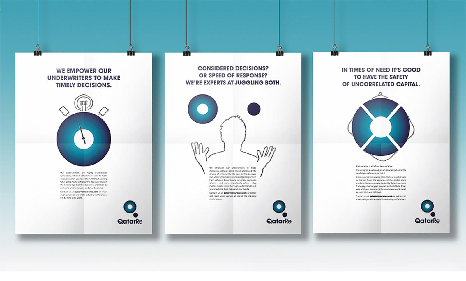 Qatar Re are a global re-insurance firm based in Zurich and owned by Qatar’s biggest insurance company. They needed advice on their brand positioning and overall look and feel. We identified the need for a more ‘Western world-facing’ tone. So the big idea here was to completely reinvent their visual identity and reflect the fact that they are a dynamic, blue-chip, international business. Hence we devised a strikingly simple new logo based a stylised letter Q. To drive awareness of the new identity we deliberately built their advertising around the logo design, resulting in a highly branded, confident campaign.
