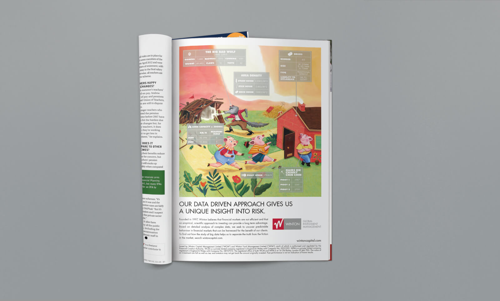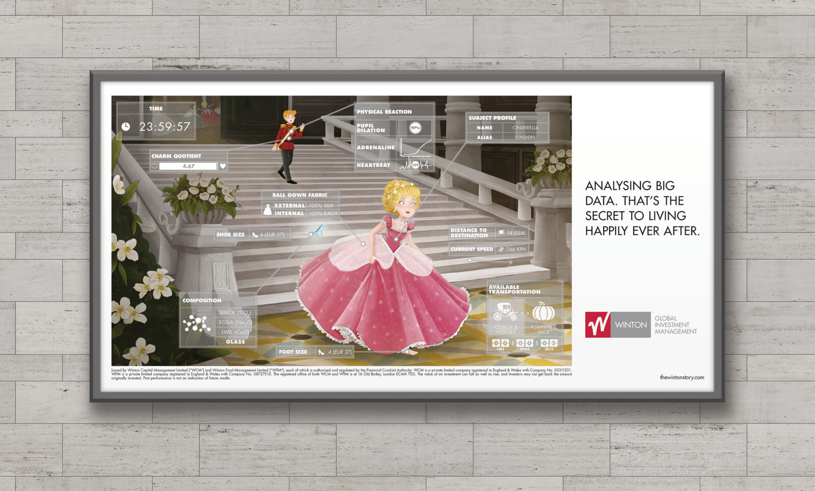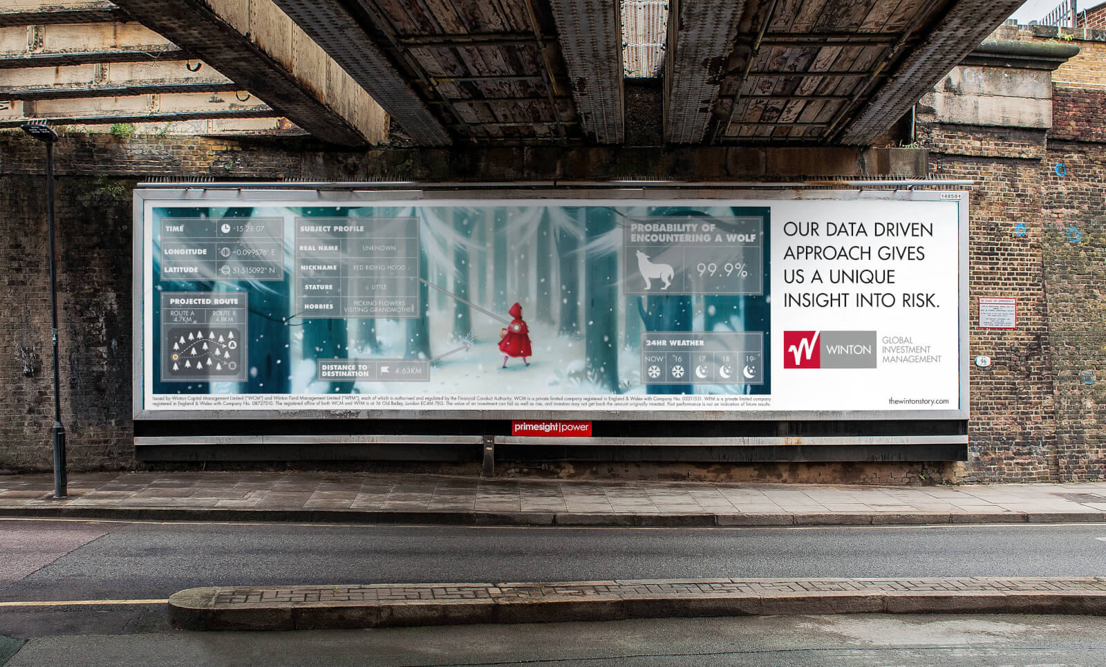 Winton are a machine-learning-driven quantitative investment company. Very high tech, very hard to explain simply. So the big idea here was to use imagery from famous fairy tales, overlaid with infographics to symbolise their data-driven approach to risk. An idea that’s both whimsical and intellectually challenging at the same time.